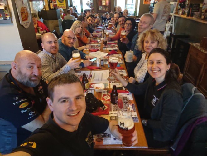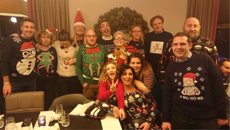 De retour à l’hôtel, une petite douche, tenue de Noël enfilée et rdv au bar pour un petit verre avant de descendre… mais où est le président….? Et bien il dort ! Il a fallu pas moins de 3 commandos pour aller le réveiller et le décider à venir ! En voiture, co-voiturage et désignation des BOBs (ou SAM pour les français !)… merci Serge et David. Petit tour dans les allées du marché de Noël et comme de coutume, rdv au bar à champagne pour le traditionnel verre…. verres. Déjà 20h30 et l’heure de remonter profiter du succulent repas préparé par Koen et son équipe. Comme d’habitude, les menus sont raffinés et préparés avec goût. Concours de pull de Noel et shooting photos…. and the winner is… comme à l’école des fans…tout le monde a gagné. La soirée se termine en toute convivialité, dans la bonne humeur et aux petites heures. Le président remercie les organisateurs avec quelques bulles.