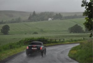 Lundi matin, 26 juin, départ pour l’Écosse, toujours Top down, malgré un ciel nuageux et un temps plus frais. Des routes au top, lacets et dos d’ânes à gogo toute la journée. Enfin nous atteignons la frontière entre l’Angleterre et l’Écosse par le Parc National Northumberland, où nous sommes accueillis par des nuées de moustiques ! Autant dire que nous ne nous sommes pas attardés. C’est ensuite un tracé d’enfer qui nous a emballés en Écosse, tout chevaux débridés et fonçant sur Édimbourg ! Pour le midi, nous décidons de trouver un joli coin au bord d’une rivière afin de pique-niquer et deux autres Aministes que nous venons de croiser, également à la recherche d’un coin sympa pour casser la croûte, se joignent à nous.