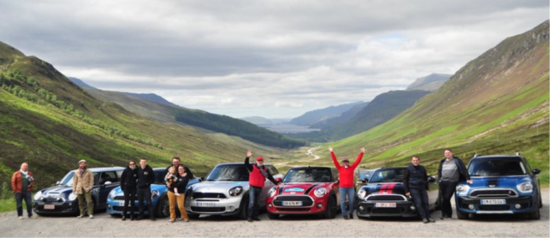 Le rendez-vous est donné avec les Aministes le samedi 24 juin au restaurant « Chez les Tontons » à Serques pour le repas de midi. Nous nous réjouissons de partager ce grand voyage tous ensemble ! Trois autres Aministes nous attendent déjà de l’autre côté de la Manche. Parvenir au Port de Calais fût quelque peu chaotique : Après un sens interdit et une pièce d’identité considérée comme dérobée, les 70 minutes de retard de notre ferry nous auront finalement sauvés et permis de monter à bord ! Les MINI chargées, nous nous installons dans le salon. La traversée dure 1h30 dans des eaux un peu agitées et sous un ciel gris. Arrivée à Douvres et déchargement rapide des véhicules où à peine remis du roulis, il faut immédiatement bien rebooter nos petits cerveaux en mode « garder sa gauche » ! Direction l’hôtel à Dartford, à environ 100km de là. On se retrouve tous avant le dîner dans le lobby de l’hôtel pour une petite séance d’information sur le déroulement du voyage ainsi que la distribution des Polos et Sweats « Spécial Écosse et CNM », commandés par Eric.